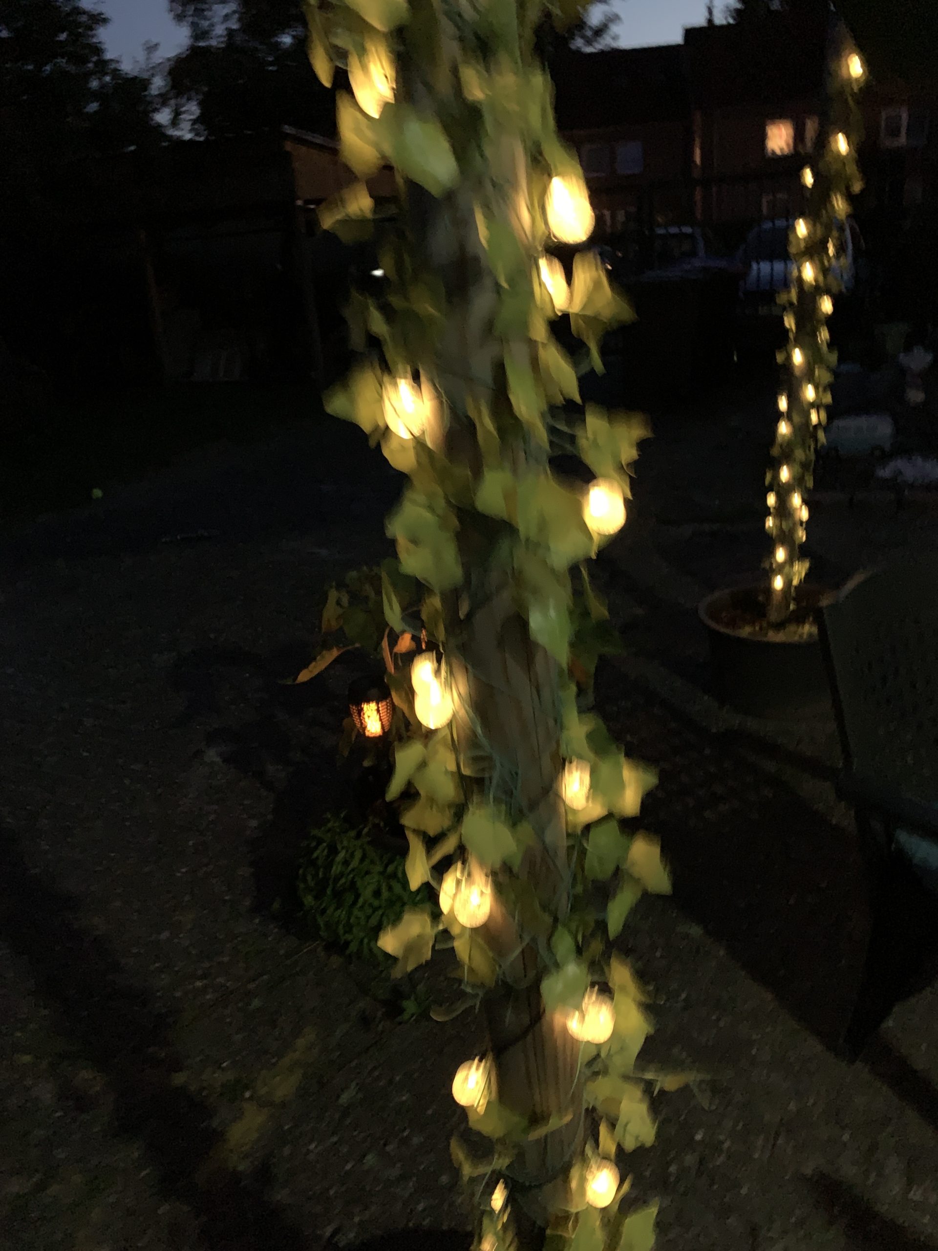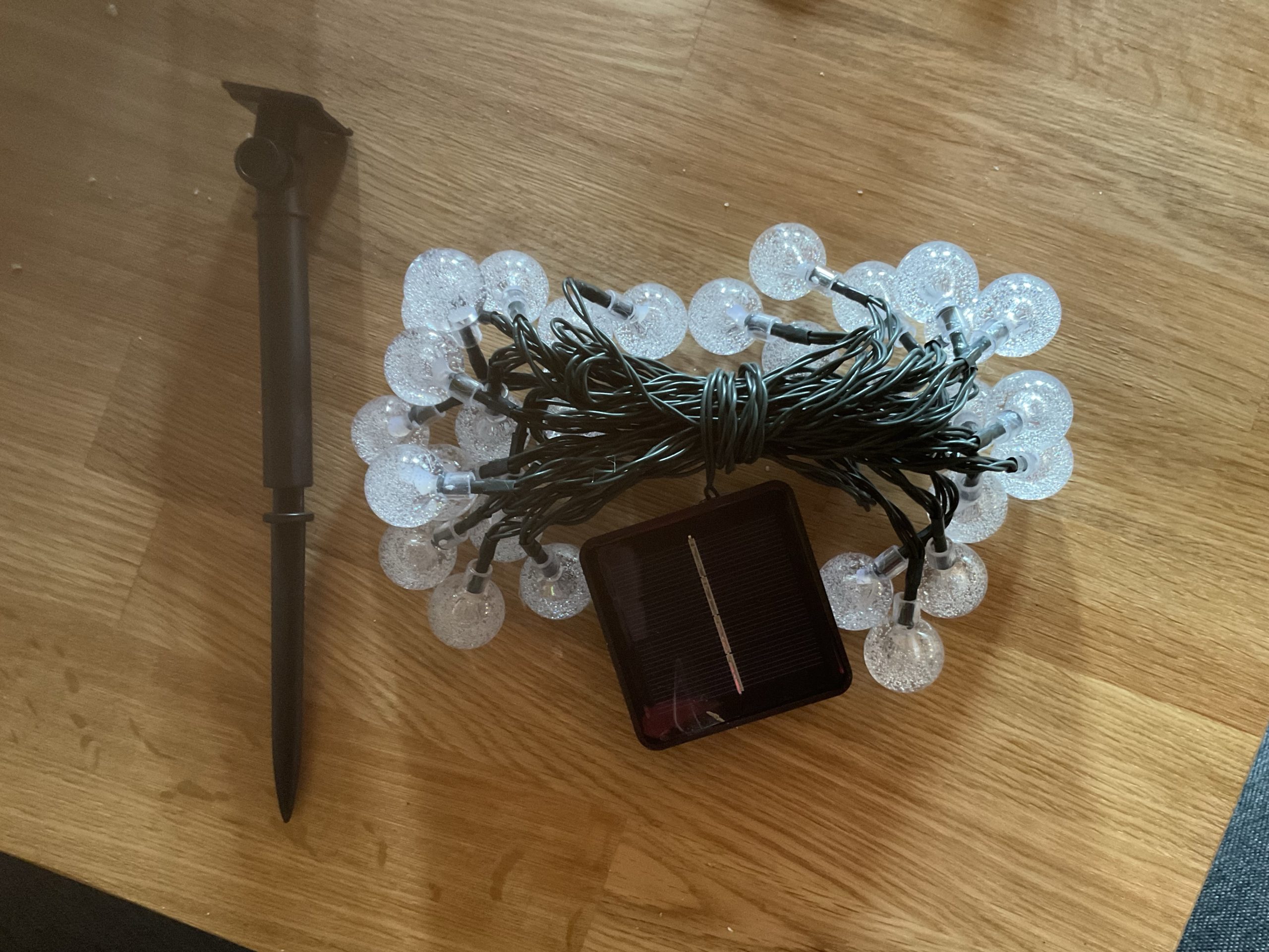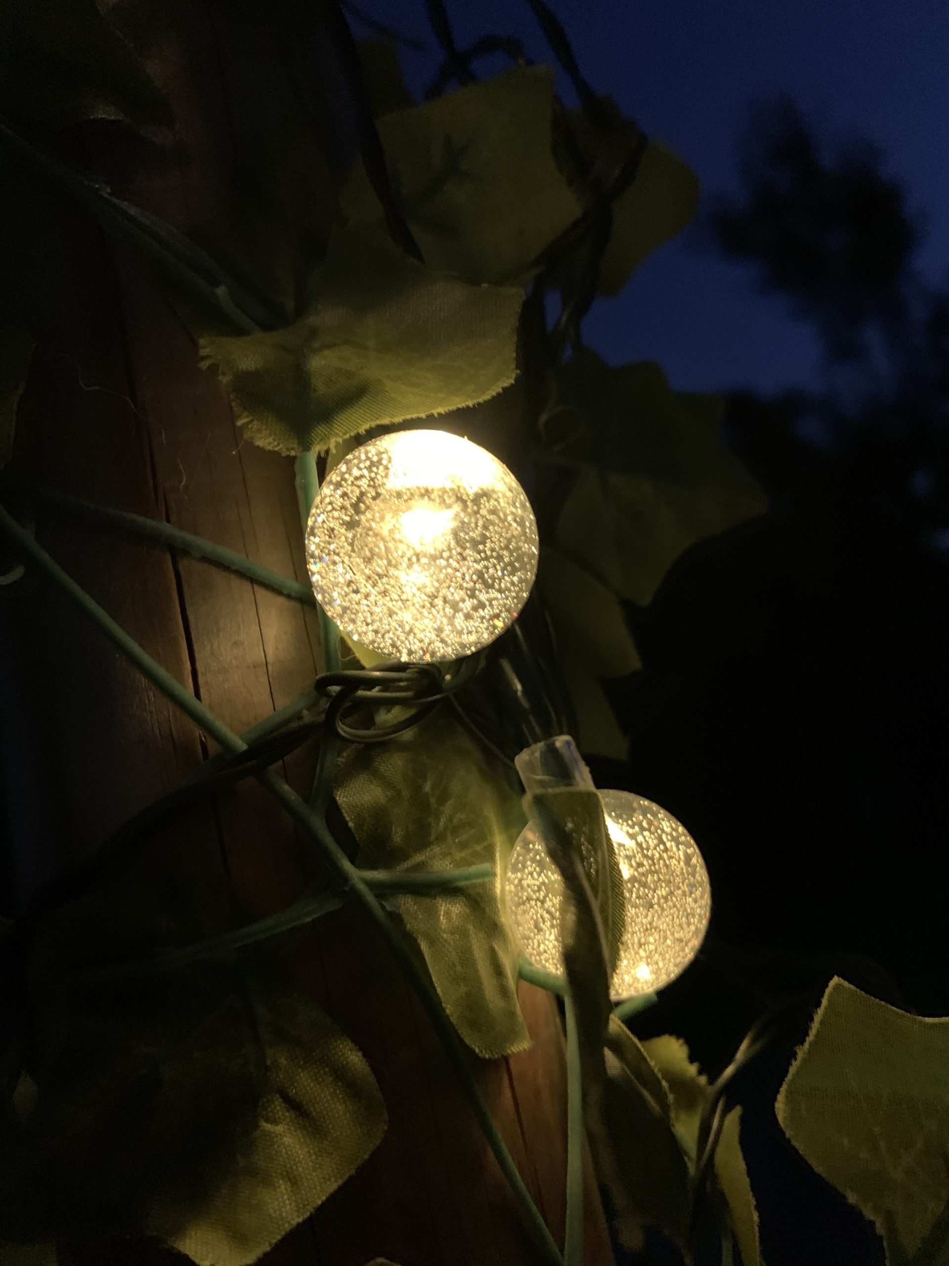 Die LED Kristallkugeln sind auch ohne großartigen Schutz heile angekommen. Nachdem ich die Lichterkette entwirrt habe war sie auch schnell angebracht. Power und Modus Knopf sind Kopfüber schwer auseinander zu halten, aber schnell wieder korrigierbar. Bereits am ersten Abend haben sie schon gut geleuchtet. Und an den folgenden Abenden um 1 Uhr Nachts noch mit voller Kraft geleuchtet. Und gestern Das Warmweiß macht sich mit den Garten Fackeln ganz gut und auch im hellen wirken die Kristallkugeln mit dem Efeu recht hübsch.