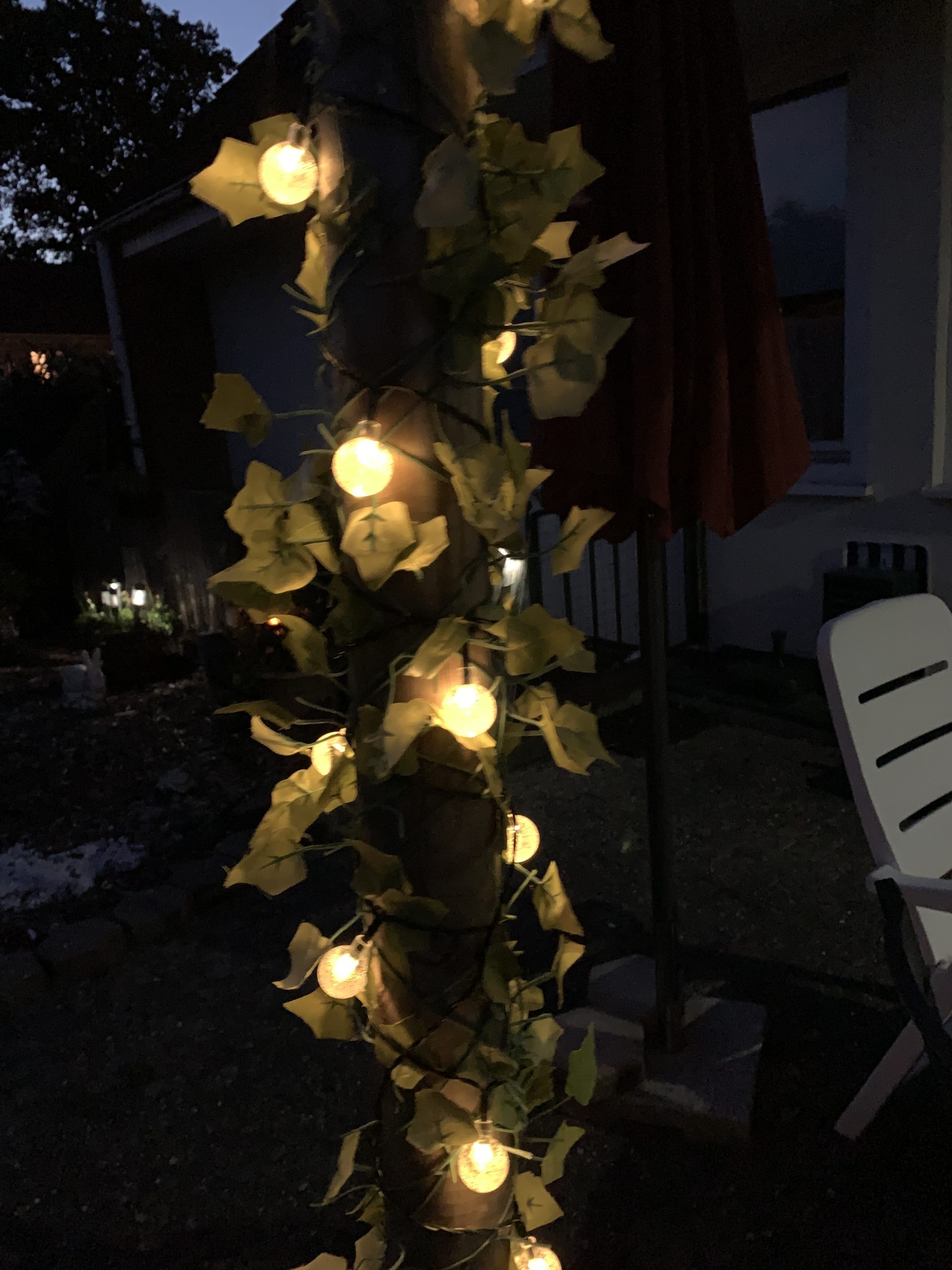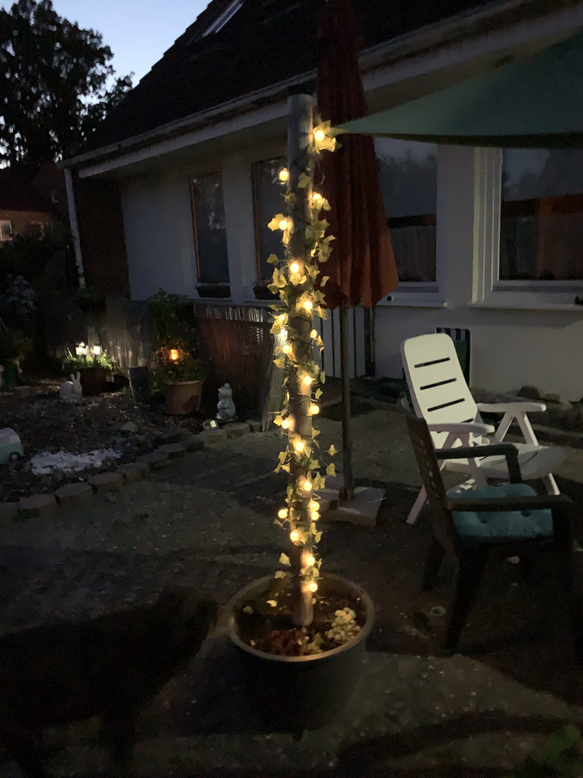 Für das Sonnensegel habe ich Zaunpfähle in Beton und Maurerkübel gebastelt. Damit die Pfähle schöner aussehen habe ich diese mit Deko Efeu(Link siehe unten) umwickelt. Jetzt fehlte hier aber noch eine dezente Beleuchtung. So habe ich mir 2 LED Lichterketten mit Solar gekauft. Ich muss ehrlich sagen in diesem Fall habe ich nur auf Preis und Anzahl der LED´s geachtet und nicht auf die Details.